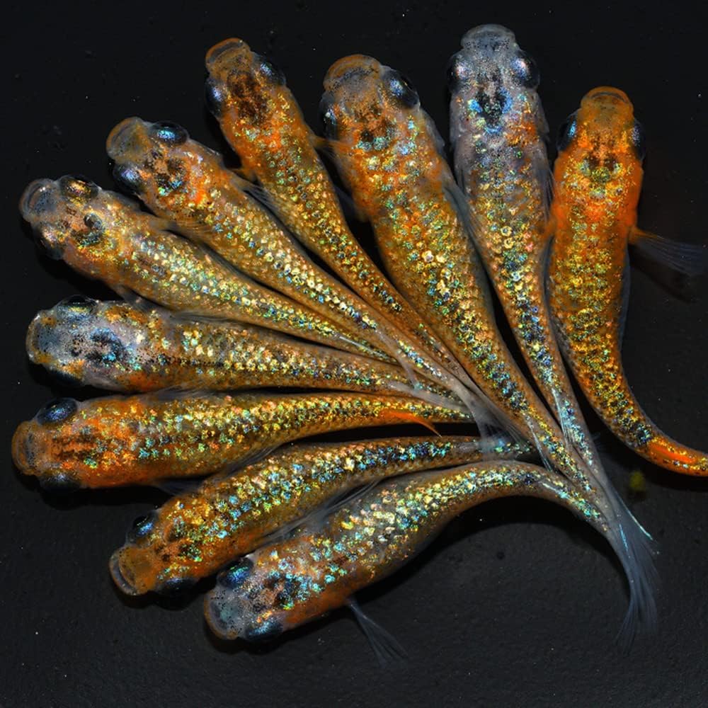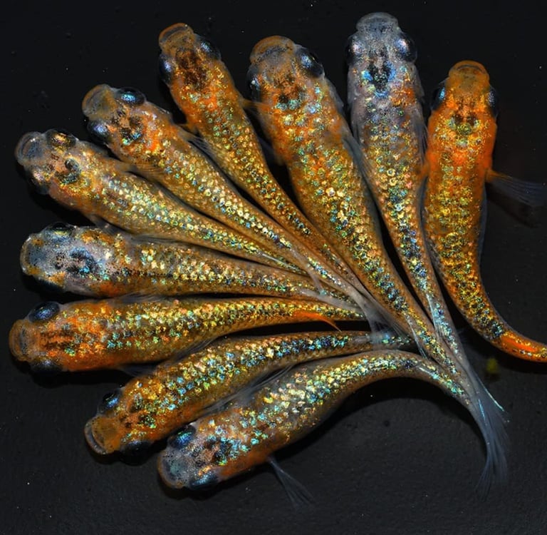 One of the most striking features of many modern medaka strains is lamé, the sparkling metallic effect visible on the body and fins.
