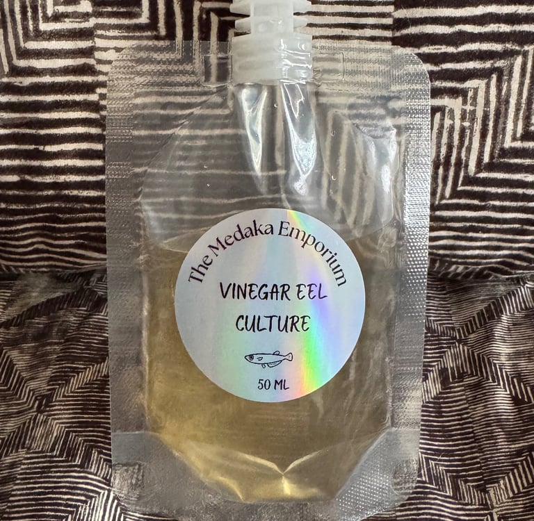 Vinegar eels are harmless, white roundworms or nematodes that feed on the microorganisms commonly found in vinegar and fermented liquids. Growing up to 50 microns in diameter and 1 to 2 mm in length, they are one of the smallest and easiest live foods to culture for baby fish.